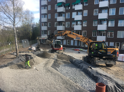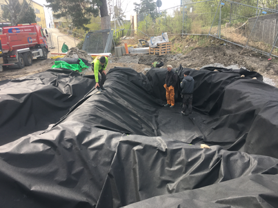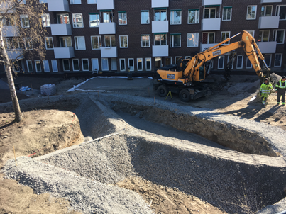 - Nockeby urban våtmark med tre bassänger om vardera 40m3, här läggs tätskiktet markduk/dammduk/markduk som sen fylls med singel, och senare plantering.
