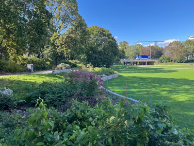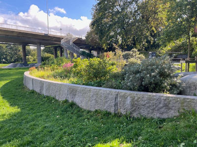 - Regnparken, där vatten från vägar leds ner och renas i en växtbädd.