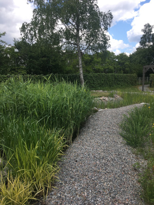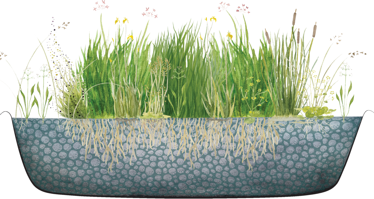 Biobädden är en central komponent som renar vattnet och bidrar till en frodig och levande miljö i landskapet med växter och ett kryllande mikroliv.