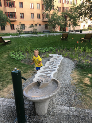 FrÄn en vattenpost, som kopplats till ledningsnÀtet, skapas vattenflödet som slingrar sig fram och rinner till sist ned i regnbÀdden.