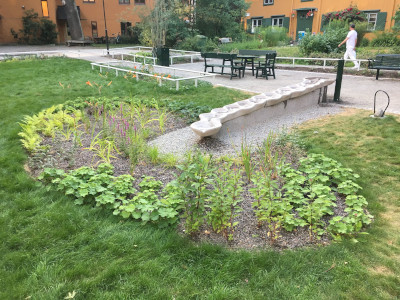 FÄ stockholmare kÀnner till FÀrgargÄrdstorget som Àr en fin liten undanskymd park invid Vita Bergen pÄ Södermalm i Stockholm. Men dÀr Àr ocksÄ ett risk för översvÀmning och dÀrför konstruerade man om den till ett skyfallsomrÄde. White Arkitekter stod för projekteringen och Bite Mark & AnlÀggning byggde.